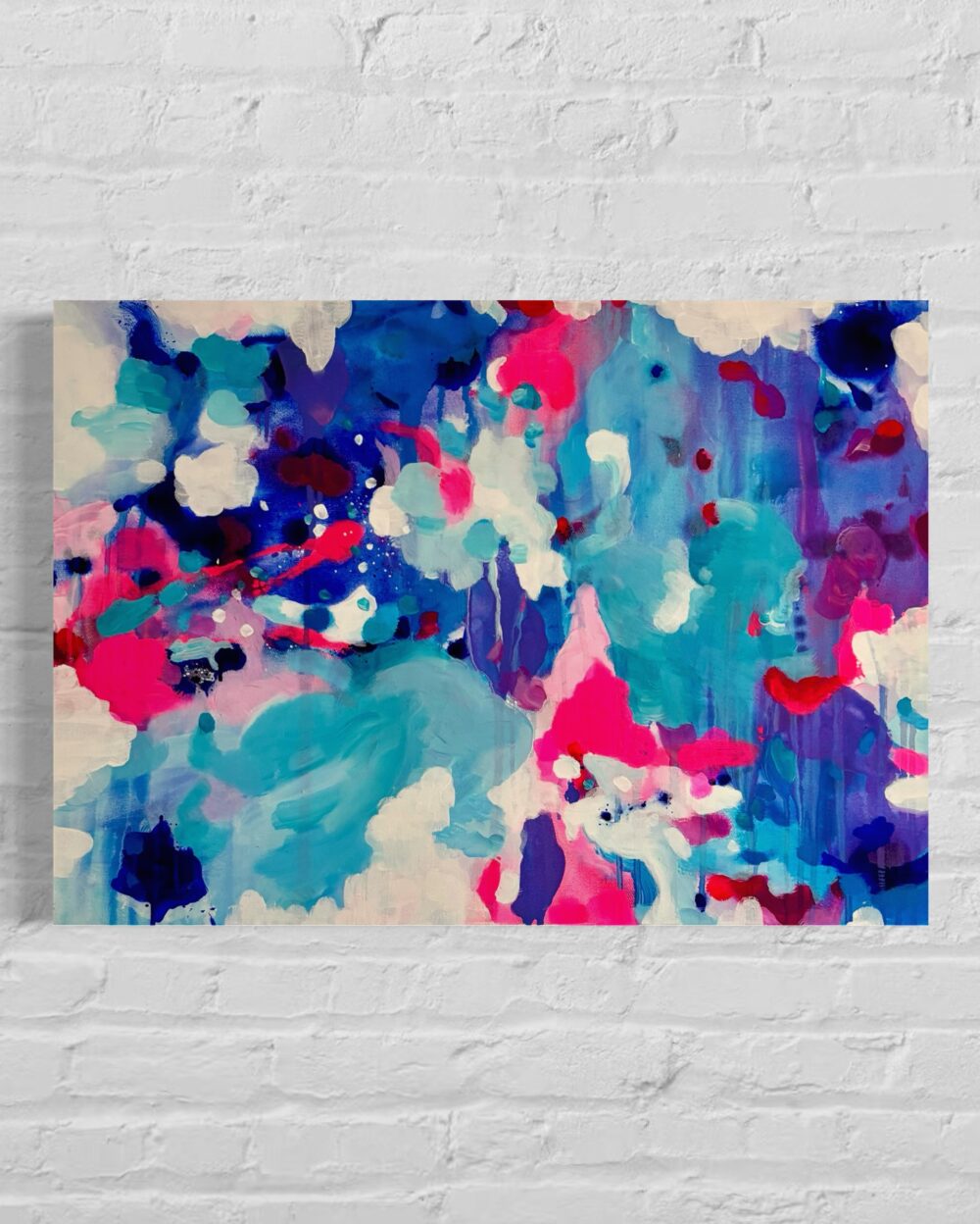 Dieses Werk öffnet ein Fenster in die unendlichen Weiten des Universums. Wie ein Blick in den Himmel lädt es dazu ein, die Begrenztheit des Irdischen hinter sich zu lassen und sich von der Weite und Unendlichkeit des Kosmos tragen zu lassen. Die fließenden Formen und intensiven Farben verschmelzen zu einer Melodie, die von Freiheit, Leichtigkeit und der Sehnsucht nach etwas Größerem erzählt.